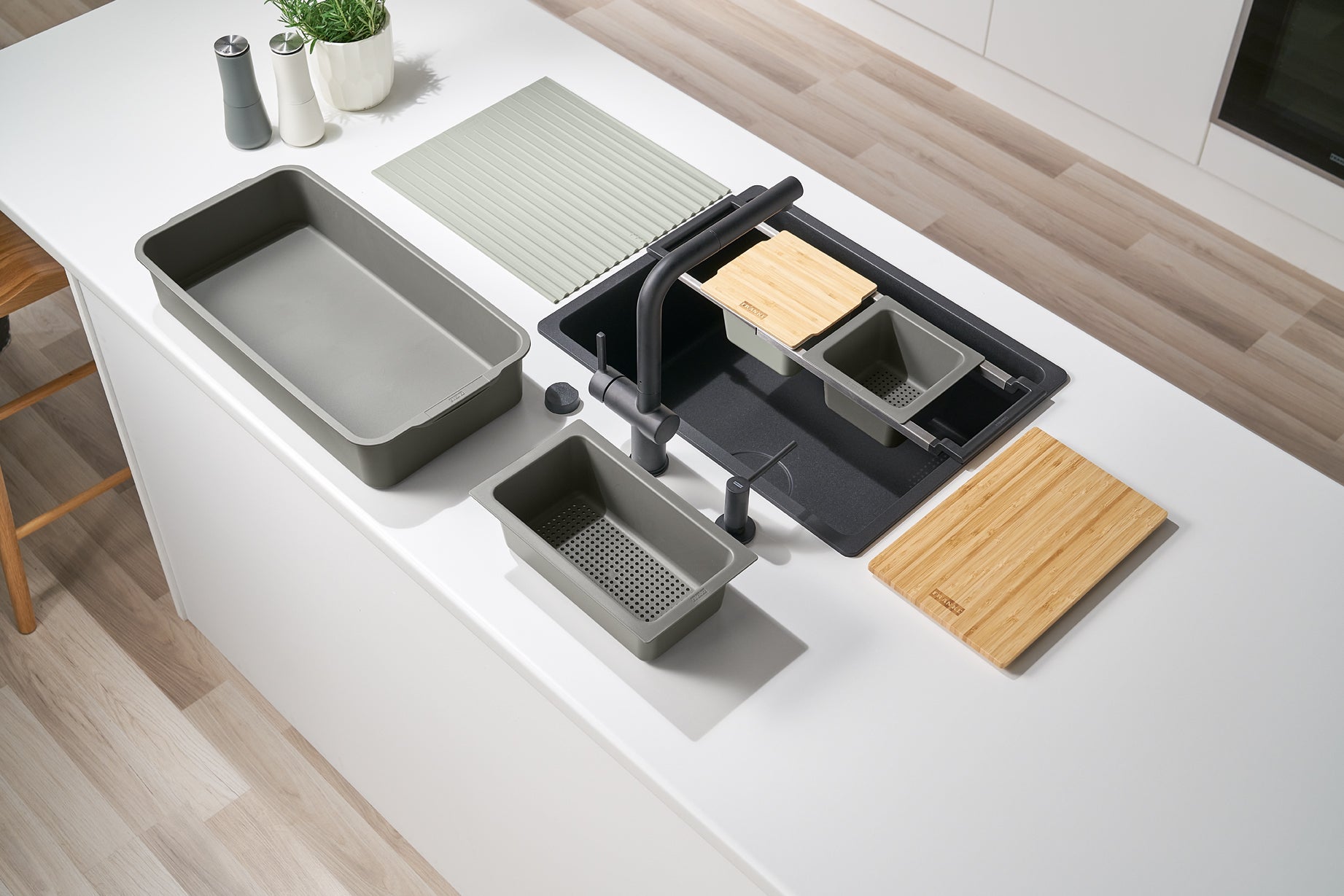 This flexible food preparation system can be used on any kitchen sink of sizes of up to 540 mm, and is a perfect match for granite and stainless steel Franke sinks.