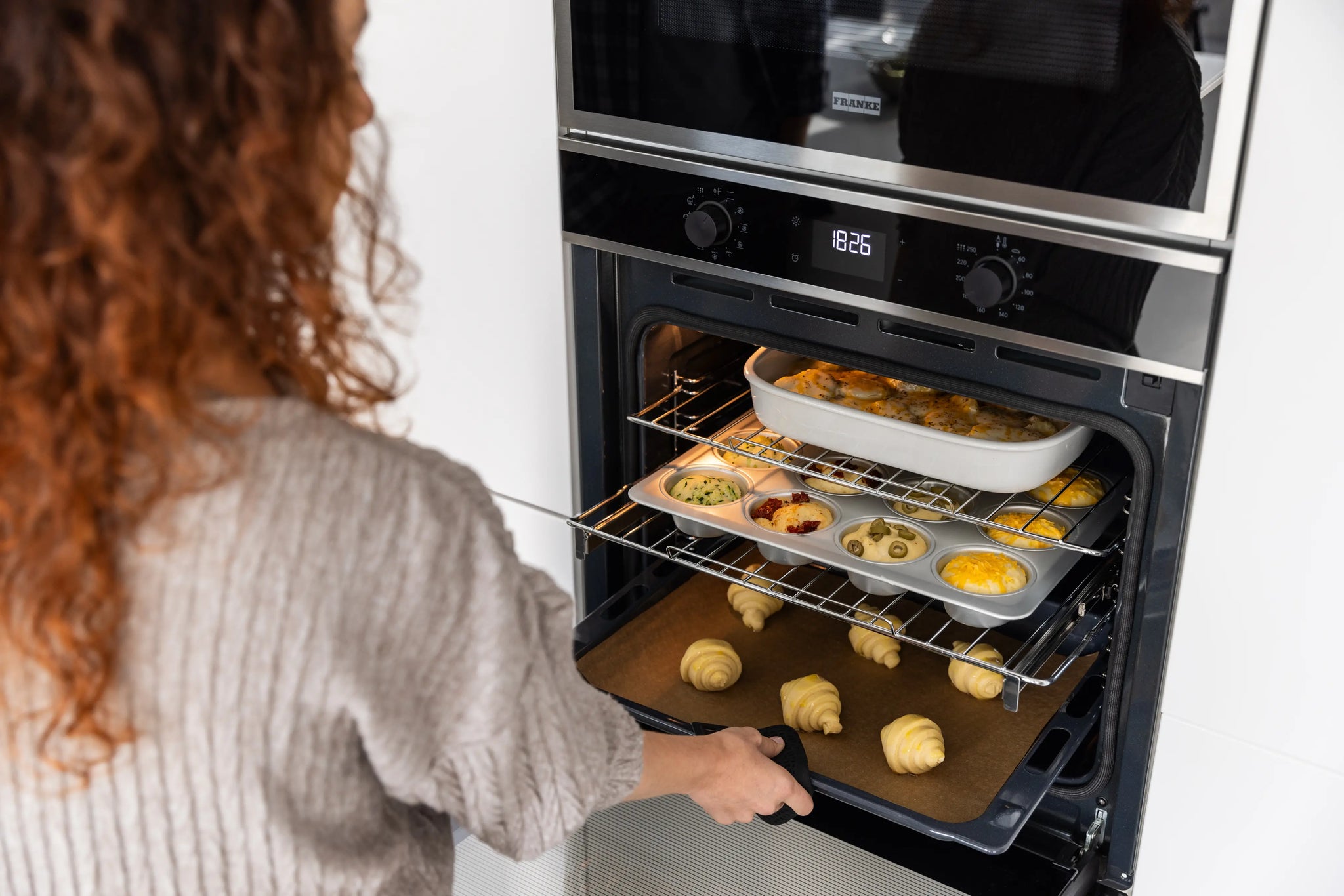 Franke Maris Oven FMA 97 P XS (116.0606.100) built-in electric oven with pyrolytic self-cleaning, A+ energy efficiency, 71L capacity, electronic touch display and versatile cooking modes including Turbo Grill and Pizza.
